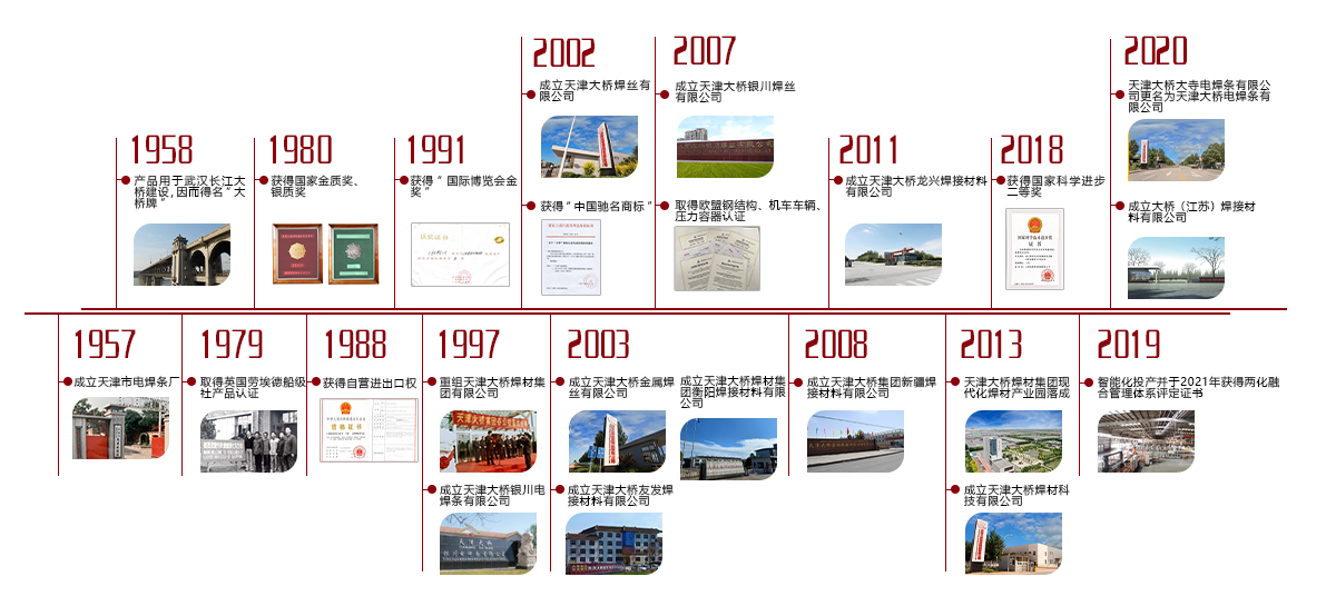 天津市電焊條廠創建于1957年。1958年,共和國橫跨長江的第一座大橋——武漢長江大橋選用天津市電焊條廠焊材,這是國產焊條首次應用在國家重點工程中,“大橋牌”由此誕生。1997年,天津市鈦鐵實業總公司與天津市電焊條廠實行股份制重組,正式創立天津大橋焊材集團有限公司。